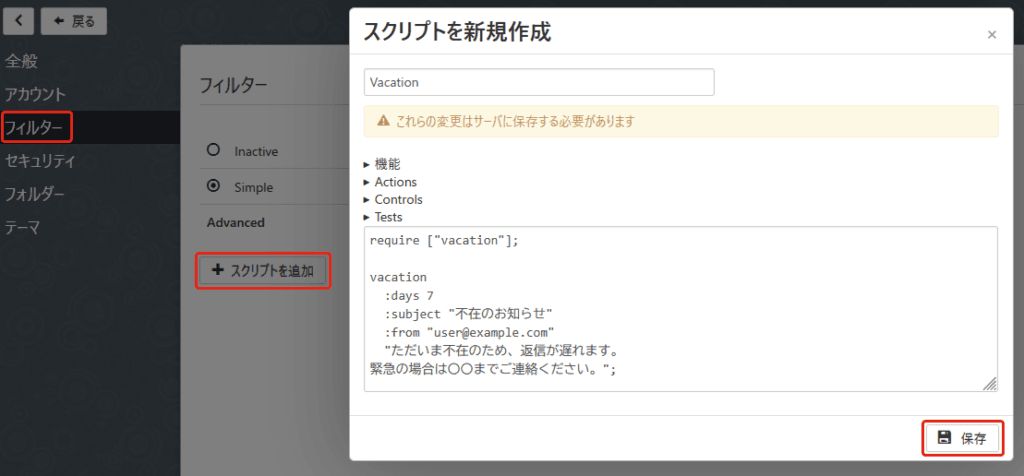 「スクリプトを追加」ボタンから Sieve スクリプトを追加する事で【方法1】と同様の設定を行うことができます。