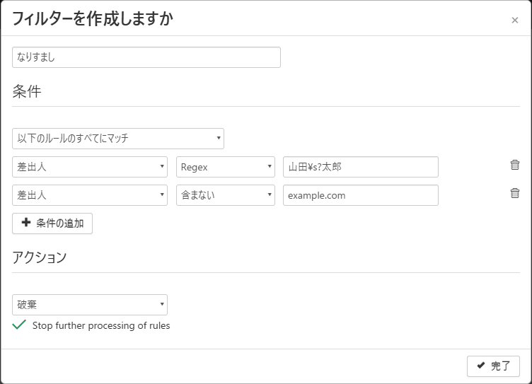 今回のなりすましメールの特徴に合わせて「表示名に社長の名前が入っていた場合」かつ「メールアドレスが自社のドメインではない場合」のブロックルールを設定していきます。