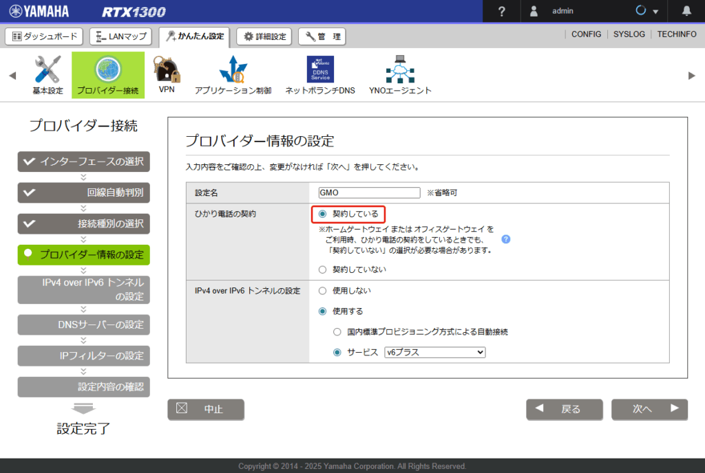 フレッツ光クロスを GUI から設定する場合は、ひかり電話の有無にかかわらず「契約している」を選択するのが正解です。