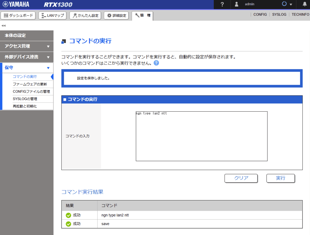「管理」から「コマンドの実行」を辿り、ngn type lan2 ntt を実行します。