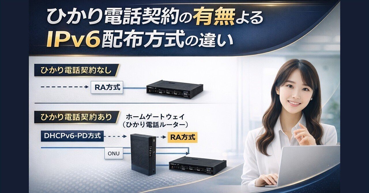 フレッツ光クロスでは IPv6 プレフィックスが、ひかり電話なしの場合でも DHCPv6-PD 方式で払い出されます。