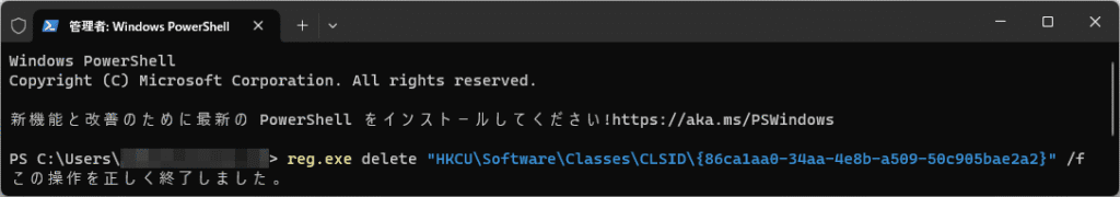 レジストリキーを、コンピューター > HKEY_CURRENT_USER > Software > Classes > CLSID と辿り、{86ca1aa0-34aa-4e8b-a509-50c905bae2a2} のキーを削除します。