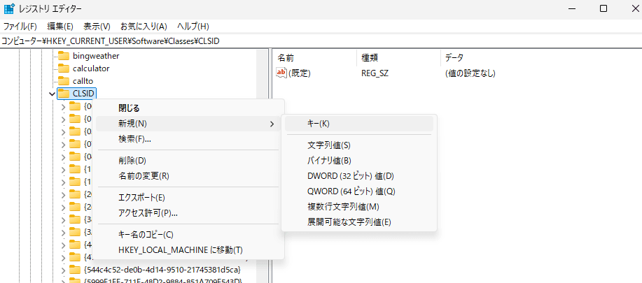 レジストリキーを、コンピューター > HKEY_CURRENT_USER > Software > Classes > CLSID と辿ります。