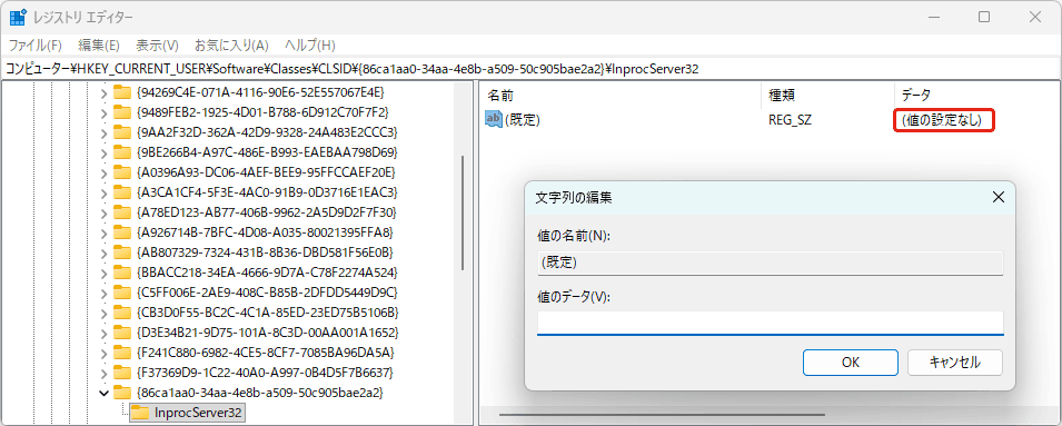 InprocServer32 を開くと、 (規定) のデータが (値の設定なし) となっています。