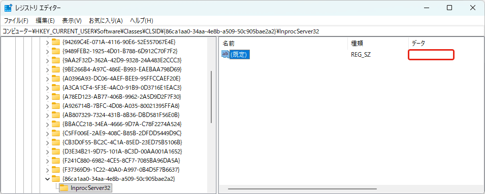 続いて、作成した {86ca1aa0-34aa-4e8b-a509-50c905bae2a2} の中に新しいキーを追加し、名前を InprocServer32 に変更します。